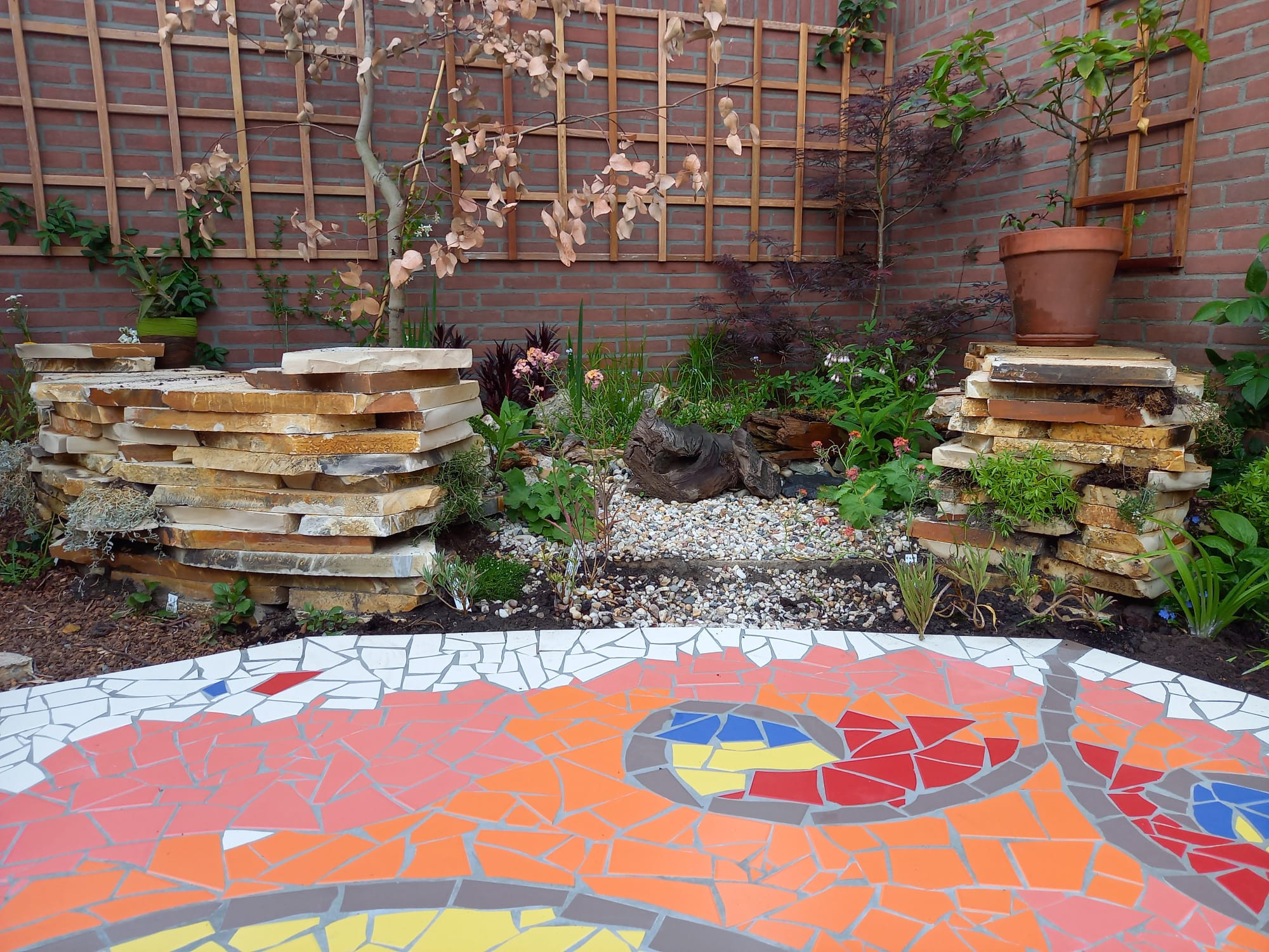 Stapelmuurtje, vijver, terras, tuinpad, mozaïek